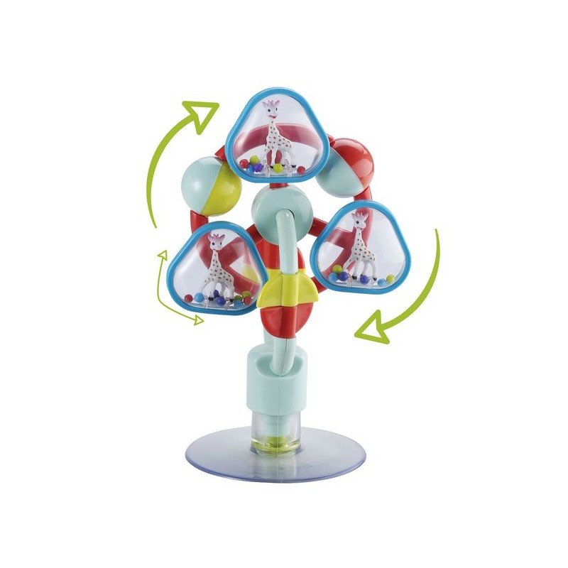 Idéal pour la chaise haute de bébé ! Un jouet d'éveil avec une large ventouse super adhérente pour occuper bébé dans sa chaise haute lors de la préparation des repas. A découvrir : - De nouveaux coloris acidulés et lumineux pour attirer l'attention de bébé - Une roue à faire tournoyer - 2 boules et 4 ailettes à faire tournoyer - 3 triangles transparents avec Sophie la girafe à l'intérieur à faire pivoter pour voir les billes colorées s'agiter et les écouter s'entrechoquer. - Un son de crécelle