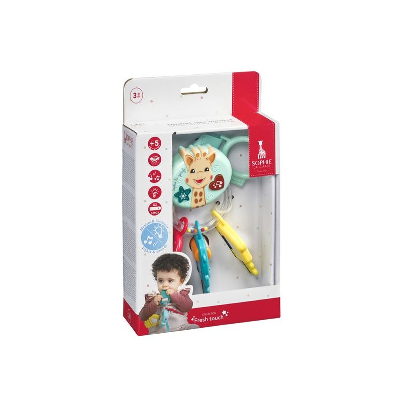 Un hochet électronique à l’effigie de Sophie la girafe avec plusieurs activités pour éveiller les sens de bébé ! 2 modes de jeu au choix : Hochet électronique : Plusieurs mélodies à écouter en appuyant sur les boutons. La lumière clignote au rythme de la musique ! Hochet classique : Des billes colorés à agiter et les clés qui s’entrechoquent à écouter ! Plusieurs activités à découvrir : Toutes les clés sont en matière souple afin de soulager bébé lors des poussées dentaires ; Une boulle transparente avec Sophie la girafe en miniature et des billes colorées à faire tourner. Un miroir pour découvrir son reflet. Un rouleau à faire tourner pour changer les personnages dans le van. Préhension facile grâce à la forme arrondie, il est également idéal pour faire découvrir à bébé la relation de cause à effet. Pratique, il suit bébé dans tous ses déplacements grâce à sa petite taille, et s’accroche partout grâce à son anneau. Piles : 2 x AAA fournies.