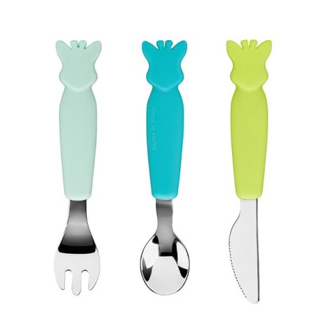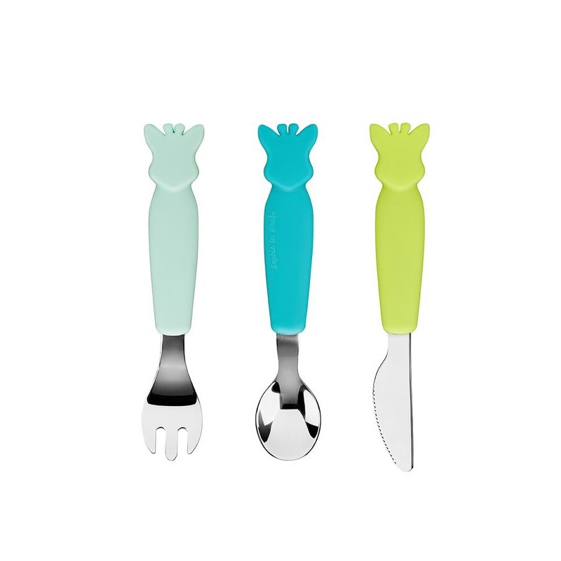 Un set de 3 couverts, pour les premiers repas en autonomie !Composé d’une fourchette, d’un couteau à bout rond et d’une cuillère.Le design et le silicone utilisé sur le manche permettent une préhension parfaite pour les petites mains de bébé.Facile d’entretien, passe au lave-vaisselle.
