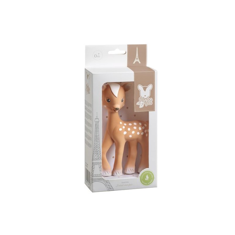 Fanfan est fabriqué en caoutchouc 100% naturel et est le premier jouet pour bébé qui stimule tous les sens. Il stimule la vision du bébé grâce aux taches et aux contrastes. Equipé d'un sifflet, il développe et divertit bébé et l'aide à comprendre la relation « cause-effet ». Doux et moelleux, le cerf est idéal pour apaiser les gencives douloureuses de bébé. Le poids léger et les longues pattes et le cou permettent aux petites mains de bébé d'attraper facilement le cerf.