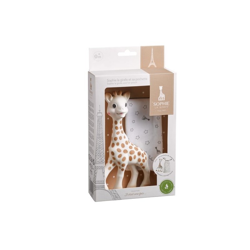 Sophie la girafe en boite cadeau accompagnée de sa pochette de rangement.