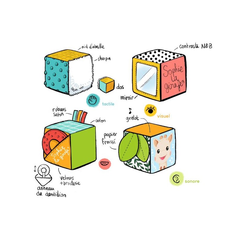Idéal pour développer la dextérité et la curiosité de bébé ! 4 cubes indépendants de couleurs et de textures différentes à saisir, attraper ou lancer par bébé. Chaque cube possède des faces différentes pour stimuler la vue, le toucher, l'ouïe et le goût. Sur chaque cube, bébé découvrira différents motifs et reliefs pour varier le sens du toucher et les couleurs pour stimuler la vision. Les bébés peuvent jouer avec les cubes, les empiler et les laisser tomber pour comprendre la relation entre cause et effet. Les cubes peuvent être emportés partout.