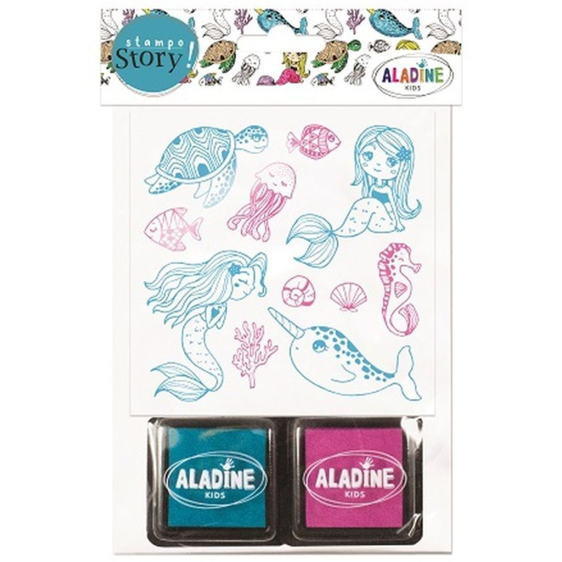 Een set van 11 foam- en rubberen stempels voor kinderen om prachtige zeemeermin-afdrukken te maken. Kleine meisjes zullen het leuk vinden om te stempelen en verhalen te vertellen. Kleurrijke afdrukken dankzij de 2 meegeleverde roze en blauwe inkten. Mogelijkheid om de tekeningen in te kleuren. 8 thema's beschikbaar naargelang de wensen van elkeen.