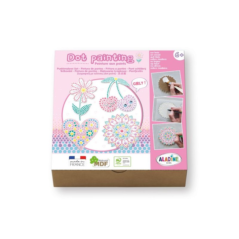 De stippenschilderijset Coeur laat kinderen kennismaken met creatief decoreren door ze te laten kennismaken met een trendy nieuwe activiteit genaamd stippenschilderen. Deze set bevat 4 stippelschildercreaties, een creatieve en rustgevende activiteit. Verf elke vorm in een kleur naar keuze. Maak vervolgens de stippen met behulp van het sjabloon en het kritérium, en breng de verf aan met behulp van de dot painting tools om stippen van verschillende grootte te maken. De verf en het hout voldoen aan de veiligheidsvoorschriften (spel/speelgoednorm EN71). De vormen om te versieren zijn gemaakt van PEFC-gecertificeerd natuurlijk en biologisch MDF geproduceerd in Frankrijk. Deze activiteit is niet alleen leuk, maar ook leerzaam en helpt kinderen hun fijne motoriek en creativiteit te ontwikkelen. Deze set, gemaakt in Frankrijk, bevat 4 middelgrote vormen, 1 sjabloon, 8 kleuren verf, een criterium, 3 naaigereedschappen en 1 borstel.