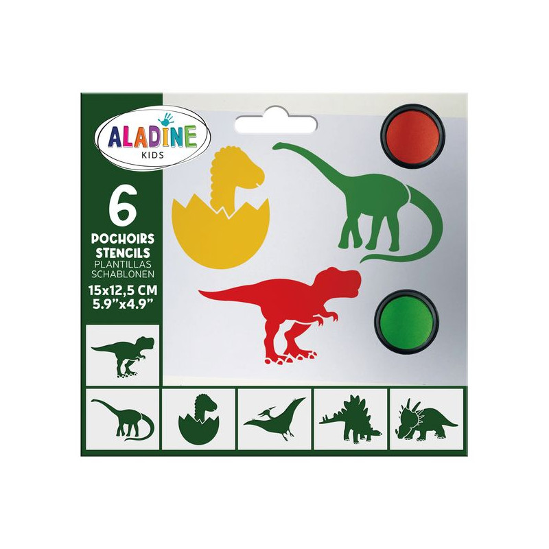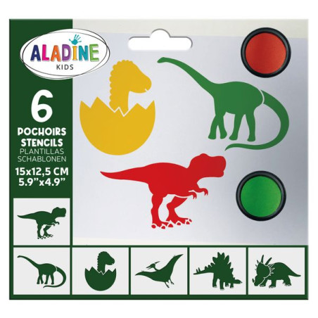 Set van 6 stencils van 15*14 cm voor kinderen met hun favoriete thema: dinosaurussen. Diplodocus, Stegosaurus, babydinosaurussen... ze zullen dol zijn op tekenen, schilderen of mooie ontwerpen maken op papier, stof of hout met de Minos-stencils, die ze naar eigen smaak kunnen aanpassen.