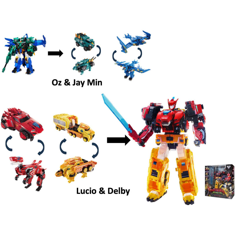 Herbeleef de avonturen van de superhelden uit je favoriete tekenfilm!Een grote favoriet: deze indrukwekkende Mega Robot belooft uren speelplezier!Transformeer voertuigen in dinosaurussen en andersom, en combineer ze om een Super Robot van 28 cm te creëren en de dinosaurussen te beschermen! Het Dinoster-team is klaar voor nieuwe uitdagingen, net als in de tv-serie!Extra: je kunt nieuwe robots maken door voertuigen uit beide sets te combineren*, zoals Lucio en Jay Min…Combineer uiteindelijk alles*, en je hebt een MEGA Robot om de slechteriken van Dino Earth te bestrijden!Aan jou de beurt om te spelen!!2 afzonderlijke referenties beschikbaar, apart verkocht
