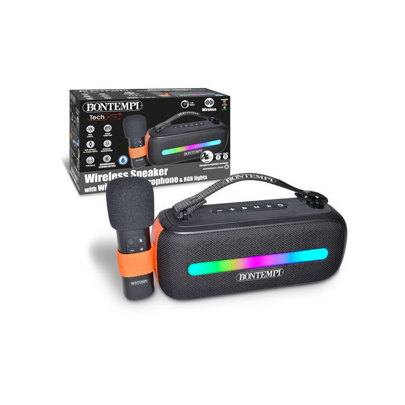 BONTEMPI-WATERBESTENDIGE, DRAAGBARE DRAADLOZE GELUIDSBOX MET DRAADLOZE MICROFOON.