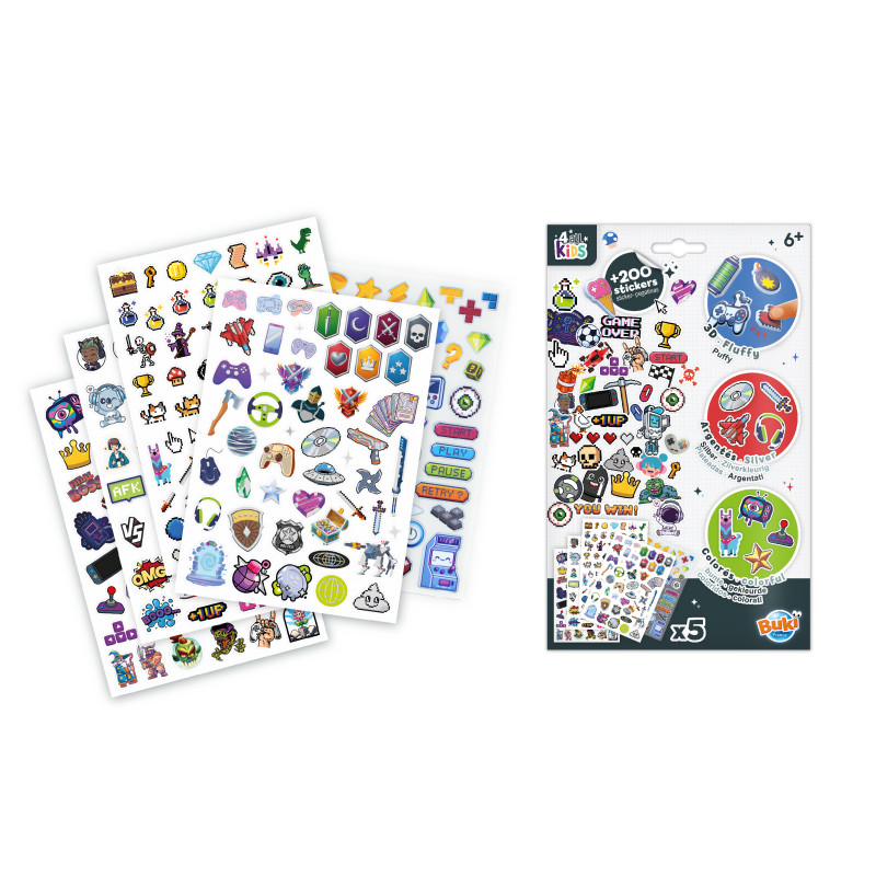 Meer dan 200 stickers met het thema videogames en computers. Stickers met gameconsoles, joysticks, raceauto's, game-figuren en nog veel meer! Het mapje bevat 5 A5-vellen: 3 gekleurde vellen, 1 vel met zilverkleurige contouren en 1 vel met fluffy stickers (zacht en dik). Plak de stickers op je schriften, tekeningen of favoriete voorwerpen. Vanaf 6 jaar.