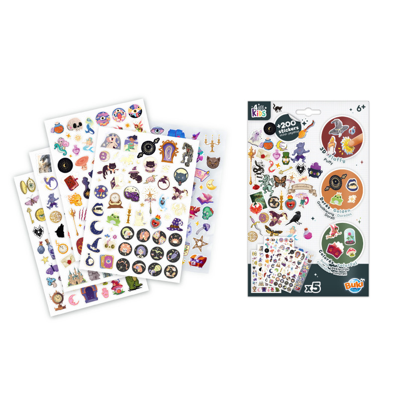 Meer dan 200 stickers met het thema fantasie en sprookjeswerelden. Stickers met toverdranken, spreukenboeken, draken, eenhoorns, toverstokken, mysterieuze dieren en nog veel meer!Het mapje bevat 5 A5-vellen: 3 gekleurde vellen, 1 vel met goudkleurige contouren en 1 vel met fluffy stickers (zacht en dik).Plak de stickers op je schriften, tekeningen of favoriete voorwerpen. Vanaf 6 jaar.