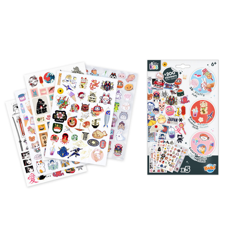 Meer dan 200 stickers met het thema manga en kawaii. Stickers met sushi, ramen, bubble tea, maneki-neko, kawaii-figuren, Japanse landschappen en nog veel meer!Het mapje bevat 5 A5-vellen: 3 gekleurde vellen, 1 vel met goudkleurige contouren en 1 vel met fluffy stickers (zacht en dik).Plak de stickers op je schriften, tekeningen of favoriete voorwerpen. Vanaf 6 jaar.