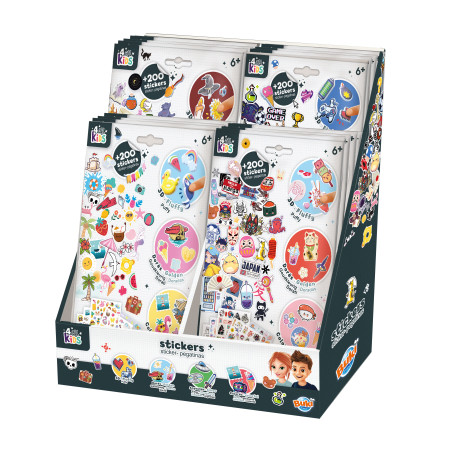 Een display met 4 modellen stickermapjes. Meer dan 200 stickers in elk mapje, verdeeld over 5 A5-vellen: 3 gekleurde vellen, 1 vel met zilver- of goudkleurige contouren, 1 fluffy vel (zacht en dik). 4 verschillende modellen: - FK018: Stickermapje Summer- FK019: Stickermapje Gaming- FK020: Stickermapje Fantasy- FK021: Stickermapje MangaDisplay wordt gevuld geleverd met 8 mapjes van elke referentie. Totaal aantal mapjes op het display: 32.Vanaf 6 jaar.