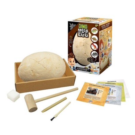 Een 20 cm hoog reuzenei in pleister om 4 dinosauruspuzzels op te graven: Tyrannosaurus, Diplodocus, Stegosaurus en Styracosaurus. Inclusief: opgraafgereedschap en een blad om te graven zonder vuil te maken.Geïllustreerde handleiding in kleur.Vanaf 8 jaar.