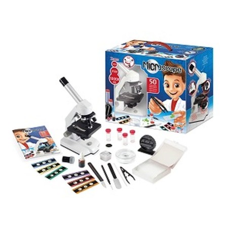Een metalen microscoop met lenzen en oculairen van glas voor kwalitatief hoogwaardige waarnemingen!3 zooms: X 100 – X 250 – X 1000 HDBevat talloze accessoires: glaasjes, pincet, flesjes, mengbeker, etiketten, petrischaaltje, micro-snijmachine…In kleur geïllustreerde handleiding. Vanaf 8 jaar.