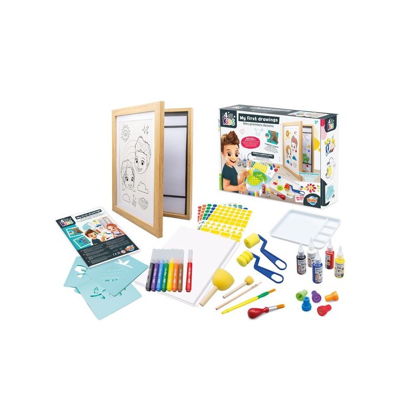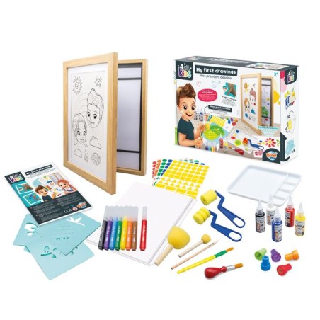 Een tekendoos met fotolijst om kindertekeningen in op te bergen en tentoon te stellen! Raak de tekeningen van je kinderen niet meer kwijt: in de lijst kunnen 50 tekeningen bewaard worden. Het kader kan worden opgehangen of op een meubel worden geplaatst.Met het meegeleverde materiaal kunnen kinderen tekenen, schilderen en stickers plakken om hun creativiteit en fijne motoriek te ontwikkelen.Bevat: Een A4-kader, 8 stiften met ronde punt, 5 stempels, 5 flesjes verf, een palet, 2 schuimrollers, 2 schuimstempels, 2 penselen, 5 sjablonen, 5 stickervellen, 10 vellen in A4-formaat van 200 g. In kleur geïllustreerde handleiding. Vanaf 3 jaar.