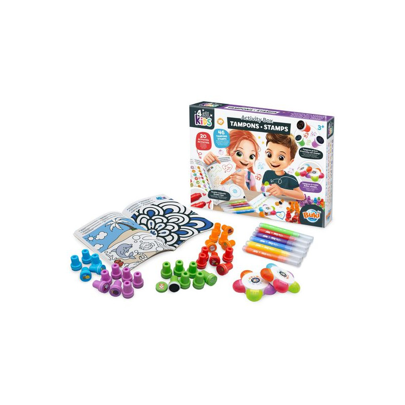 Een activiteitendoos met meer dan 45 verschillende stempels om de creativiteit en motoriek van kinderen te ontwikkelen!Met het activiteitenboekje van 20 pagina's kunnen kinderen kleuren, creëren en stempelen op de meegeleverde ondergronden!Elke stempel wordt aangeboden met 5 verschillende inktkleuren: paars, rood, oranje, blauw en groen.Bevat: 30 zelfinktende stempels met verschillende thema's (dieren, insecten, voertuigen, personages, groenten & fruit), 6 stiften met een ronde punt aan de ene kant en een stempel aan de andere kant, 2 stempelbloemen om met elke bloem 5 verschillende randen te maken, een activiteitenboekje van 20 pagina's.Vanaf 3 jaar.