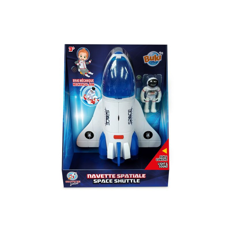 Een spaceshuttle om astronauten de ruimte in te sturen voor nieuwe ontdekkingen. Druk op de rode knop om de lanceringsgeluiden te activeren en de lampen van de spaceshuttle aan te doen. Open de deuren om de mechanische scharnierarm uit te strekken. Inbegrepen: een astronaut van 7,5cm die zich op de mechanische arm kan installeren en in de cockpit kan zitten.Vanaf 3 jaar. Vereist 2 batterijen LR03, inbegrepen.
