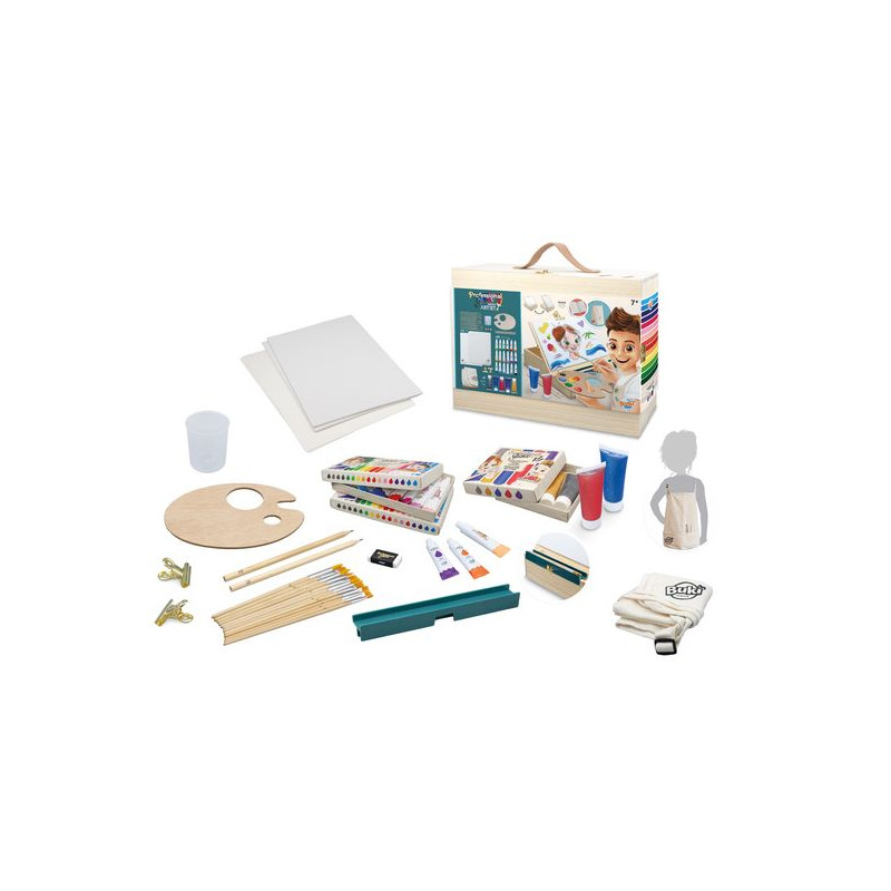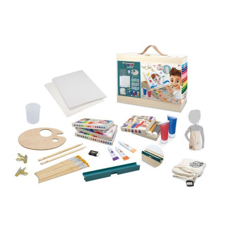Trek je schort aan en leer de technieken van acrylschilderen met deze houten koffer die je kunt omtoveren tot een schildersezel! De koffer heeft twee inkepingen waarmee je de schuine stand van de ezel kunt kiezen. De ezel kan verticaal of horizontaal worden geïnstalleerd. Maak je vel of schildersdoek vast met de twee meegeleverde clips. Gebruik de bijgeleverde gids om alles te leren over de technieken van acrylschilderen! Als je klaar bent, ruim je alle accessoires op in de koffer die je met het handvat overal mee naartoe kunt nemen. Inbegrepen accessoires: 1 schildersschort, 2 dunne schildersdoeken (A4-formaat), 5 A4-vellen 230g, 2 metalen bevestigingsclips, 12 penselen in verschillende maten en vormen, 1 gum, 1 HB-potlood, 1 2B-potlood, 1 houten palet met beker, 18 tubes acrylverf van 22ml en 5 tubes glitterverf van 20ml. Gids met afbeeldingen in kleur. Vanaf 7 jaar.