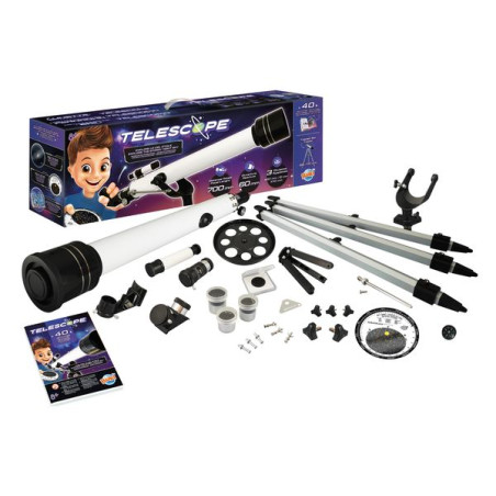 Een telescoop met een handleiding met 40 activiteiten voor het ontdekken van de sterrenhemel, de planeten en het maanlandschap. Volledig metalen buis. Diafragma met een diameter van 60 mm en brandpuntsafstand van 700 mm. 3 meegeleverde oculairs: 20 mm, 6 mm en een Kellner-oculair van 10 mm, verwisselbaar. Aluminium driepootstatief met twee standen: 65 en 110 cm. Talloze accessoires inbegrepen: 1 zoeker van 5x24 mm, 1 Barlowlens 3x, 1 maanfilter en 1 hemelkaart om zich te oriënteren. In kleur geïllustreerde handleiding. Vanaf 8 jaar.