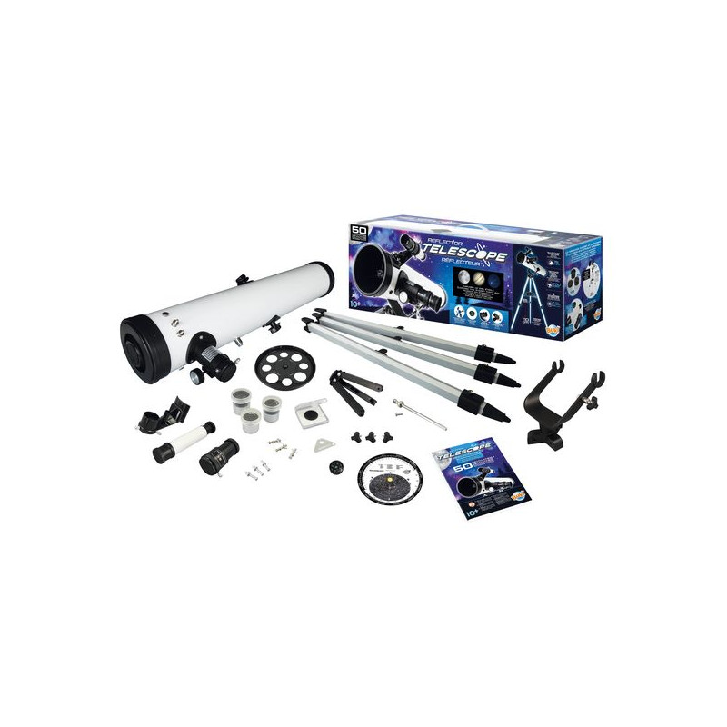 Een reflectietelescoop met een handleiding met 50 activiteiten voor het ontdekken van de sterrenhemel, de planeten en het maanlandschap. Volledig metalen buis. Diafragma met een diameter van 76 mm en brandpuntsafstand van 700 mm. 3 meegeleverde oculairs: 20 mm, 6 mm en een Kellner-oculair van 10 mm, verwisselbaar. Aluminium driepootstatief met twee standen: 65 en 110 cm. Talloze accessoires inbegrepen: 1 zoeker van 5x24 mm, 1 Barlowlens 3x, 1 maanfilter en 1 hemelkaart om zich te oriënteren. In kleur geïllustreerde handleiding. Vanaf 8 jaar.