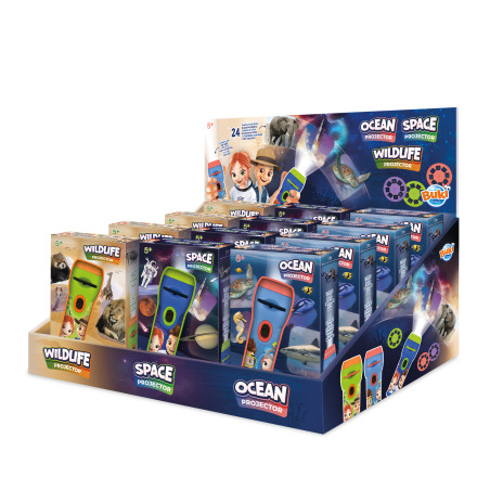 Een zaklamp om prachtige foto's te projecteren op de muur of het plafond. Projectiegrootte: tot 1 meter. Elke projector bevat 3 schijven met 24 exclusieve foto's. 3 werelden:- Dieren: savanne, jungle, tropisch woud en poolcirkel.- De ruimte: planeten, nevels, sterrenstelsels en archieven over de ontdekking van de ruimte.- Oceaan: vissen, haaien, reptielen, weekdieren en zeezoogdieren.Te downloaden geïllustreerd boekje met informatie over elke afbeelding.Vereist 2 batterijen LR03-AAA, niet inbegrepen. Vanaf 5 jaar.