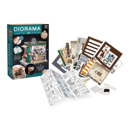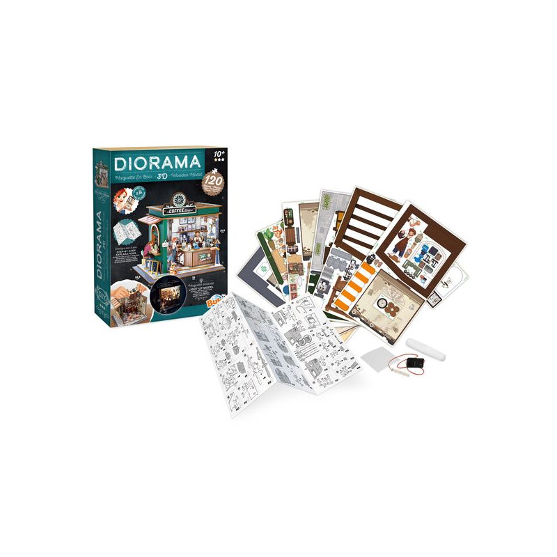 Zet de houten onderdelen in elkaar en bouw je eigen miniatuurcafé.Lijm, maak de onderdelen en plaats meubels, accessoires, planten en klanten om de gezellige sfeer van een café na te bootsen. De montage is eenvoudig met de stap-voor-stap geïllustreerde instructies en genummerde onderdelen. Als het café af is, wordt het een prachtig decoratief voorwerp voor in je slaapkamer. Bekijk elk detail: het koffiezetapparaat, de kopjes, de uithangborden... Gebruik 's avonds de meegeleverde led-verlichting om het café van binnen te verlichten. Afmeting in elkaar gezet café: 14,5 x 16 x 15,8 cmMontagetijd: 2 tot 3 uur.Aantal onderdelen: 120.Vereist 3 LR1130-batterijen (meegeleverd). Vanaf 10 jaar.