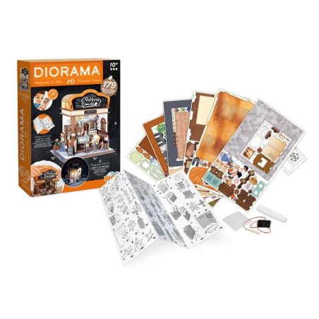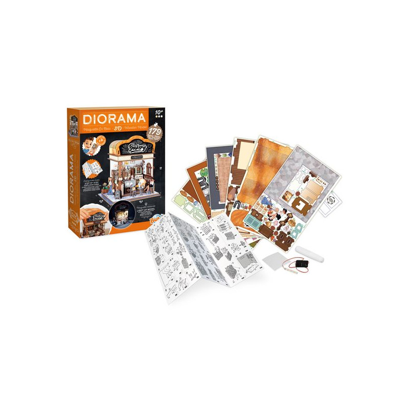 Zet de houten onderdelen in elkaar en bouw je eigen miniatuurbakkerij.Lijm, maak de onderdelen en plaats meubels, accessoires, lekkernijen en klanten om de gezellige sfeer van een café na te bootsen. De montage is eenvoudig met de stap-voor-stap geïllustreerde instructies en genummerde onderdelen. Als de bakkerij af is, wordt het een prachtig decoratief voorwerp voor in je slaapkamer. Bekijk elk detail: de zoete broodjes, de gebakjes, de broden... Gebruik 's avonds de meegeleverde led-verlichting om de bakkerij van binnen te verlichten. Afmeting in elkaar gezette bakkerij: 14,5 x 16,2 x 18 cmMontagetijd: 2 tot 3 uur.Aantal onderdelen: 179.Vereist 3 LR1130-batterijen (meegeleverd). Vanaf 10 jaar.