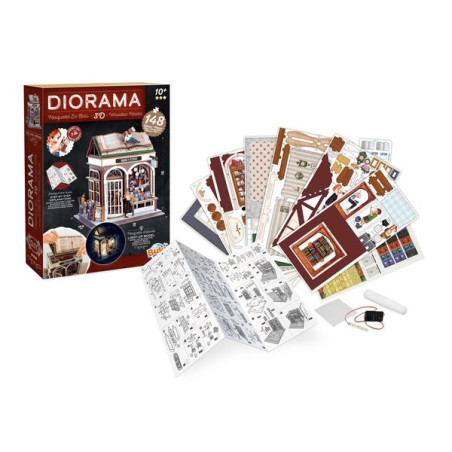 Zet de houten onderdelen in elkaar en bouw je eigen miniatuurboekenwinkel.Lijm, maak de onderdelen en plaats meubels, accessoires, planten en boeken om de gezellige sfeer van een boekenwinkel na te bootsen. De montage is eenvoudig met de stap-voor-stap geïllustreerde instructies en genummerde onderdelen. Als de boekenwinkel af is, wordt het een prachtig decoratief voorwerp voor in je slaapkamer. Bekijk elk detail: de boeken, de planken, het zitgedeelte... Gebruik 's avonds de meegeleverde led-verlichting om de boekenwinkel van binnen te verlichten. Afmeting in elkaar gezette boekenwinkel: 14,5 x 16 x 18 cmMontagetijd: 2 tot 3 uur.Aantal onderdelen: 148.Vereist 3 LR1130-batterijen (meegeleverd). Vanaf 10 jaar.