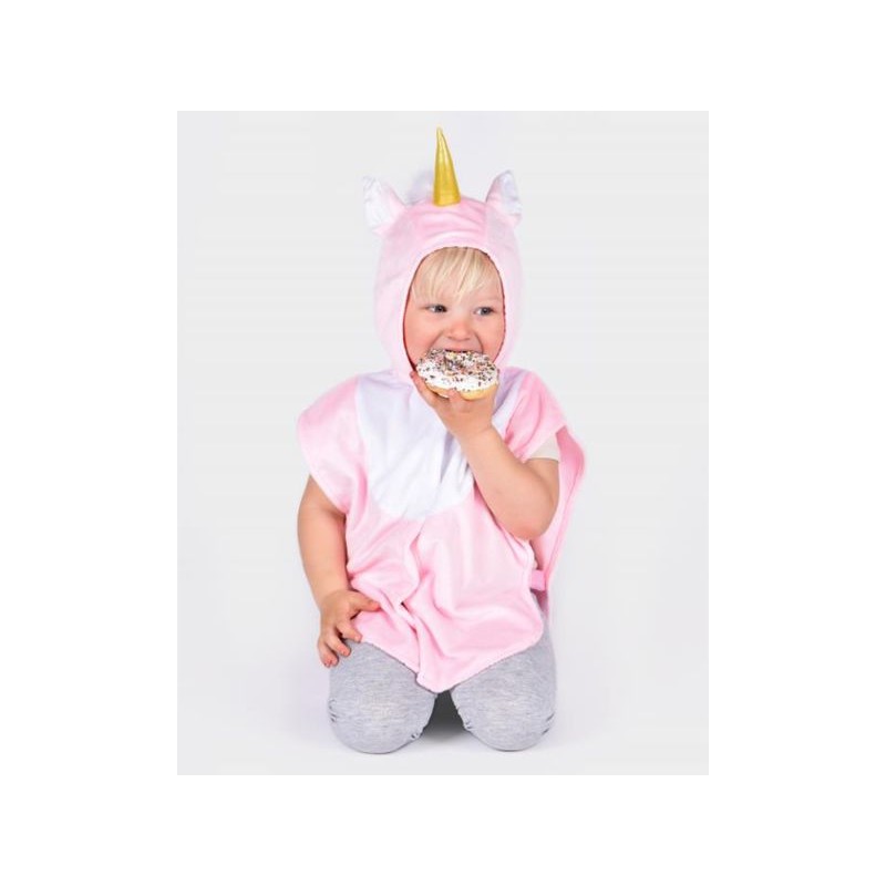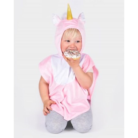 Roze eenhoorn minicape met kap. Kunstbont staart op de rug. Gewatteerd goudkleurige hoorn en oren op de kap. Klittenbandsluiting aan de voorkant en elastische linten aan de zijkanten.