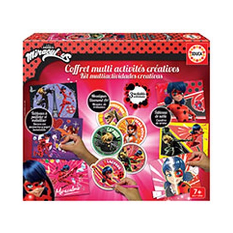 Een multi-activiteitendoos om prachtige creaties te maken met Miraculous Ladybug! Met deze set kun je verschillende activiteiten maken, de een nog sprankelender dan de ander: Zandplaatjes, Glitter- en goudplaatjes, Diamantkunstmozaïek. Als je klaar bent, plaats je je creaties in een glanzende lijst. Bevat: 3 zelfklevende zandborden, 3 zelfklevende glitter- en metallicborden, 3 tubes glitter, 3 tubes zand, 6 vellen metallic papier, 5 kaarten om te versieren met glitter, 1500 mini-strass steentjes, 1 mini-strass tool, 1 bakje voor diamanten en wax square, 1 metallic papier tool, 5 linten, instructies.