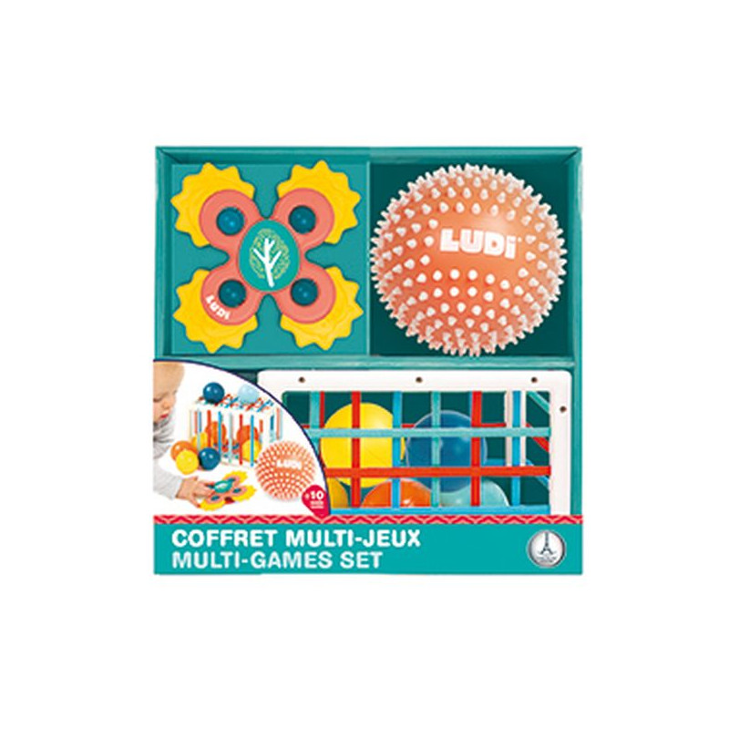 Een schatkist vol ontdekkingen voor baby’s vanaf 10 maanden! Met de LUDI Multi-spelenset ontdekt, voelt en speelt baby — en vooral: hij heeft plezier! Deze slimme set bundelt drie complementaire speeltjes die speciaal zijn ontworpen om de ontwikkeling van baby’s vanaf 10 maanden te stimuleren. Sensorisch, leerzaam en evolutief: uren spelplezier verzekerd! Een sensorische set om spelenderwijs te groeien De set bevat een zachte, getextureerde sensorische bal die de tastzin stimuleert. De zachte nopjes zorgen voor een ontspannend massage-effect – ideaal na het bad of tijdens rustige momenten. De manipulatiedobbelsteen biedt twee moeilijkheidsniveaus en traint baby’s nieuwsgierigheid, fijne motoriek en hand-oogcoördinatie via gekleurde elastieken en rammelende balletjes. De “baby spinner” met zuignap kan op een tafel, kinderstoel of raam worden bevestigd. De vier kleurrijke propellers draaien razendsnel en trekken de aandacht van baby, wat de visuele waarneming en armbewegingen stimuleert. Evolutief speelgoed voor kleine handjes Ontworpen voor kinderen vanaf 10 maanden, met gemakkelijk vast te pakken vormen, levendige kleuren en verschillende texturen. Elk element moedigt zelfstandigheid en ontdekking aan, thuis of onderweg. Kenmerken: Afmetingen Baby Spinner: Ø 14 x 4 cm Afmetingen bal: Ø 13 cm Afmetingen manipulatiedobbelsteen: 12 x 18 x 12 cm Materiaal: PVC, ABS Reinigen met vochtige doek Opblazen met een handpomp (geen elektrische pomp) Vanaf 10 maanden