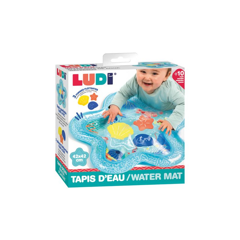 Een oceaan van speelplezier voor de allerkleinsten! Met de LUDI Watermat “Ster” ontdekt baby een fris, zintuiglijk universum vanaf 10 maanden. Deze originele speelmat in stervorm verandert buikspeeltijd in een magische waterervaring. Zintuiglijk spel met zeetinten De kleurrijke mat toont vrolijke zeedieren en bevat drie drijvende schelpjes die bewegen wanneer baby op de mat drukt. Door de schelpjes te volgen, oefent baby hand-oogcoördinatie, concentratie en fijne motoriek. Het water stroomt onder de druk van de handen — fascinerend en rustgevend tegelijk! Frisse of ontspannende ervaring Vul de mat met warm of koud water om de tastzin op verschillende manieren te stimuleren — ideaal voor warme dagen of na een actieve speelsessie. Perfect om baby op de buik te laten spelen, wat helpt bij het versterken van rug-, arm- en nekspieren. Kenmerken: Afmetingen: 42 x 42 x 4 cm Samenstelling: 100% PVC Reiniging: met een vochtige doek Na elk gebruik leegmaken en laten drogen Montage/demontage door een volwassene