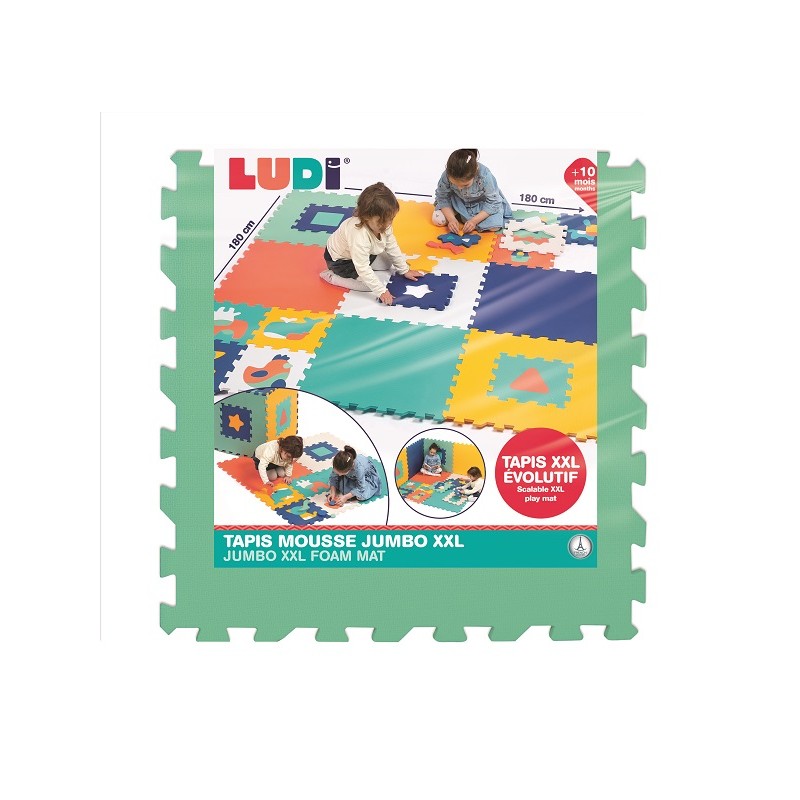 Een speelse en veilige ruimte voor je baby!De schuimrubberen speelmatten van LUDI zijn ontworpen om een veilige, comfortabele en stimulerende speelomgeving te bieden voor de allerkleinsten. Kleurrijk, hygiënisch en voorzien van verschillende texturen: deze matten begeleiden je baby in alle veiligheid bij de eerste ontdekkingen!De ideale speelmat voor kleine ontdekkingsreizigersDe schuimrubberen "Jumbo"-mat is perfect om kinderen te isoleren tegen een koude ondergrond, schokken op te vangen en is bovendien bestand tegen nieuwsgierige melktandjes. De felle kleuren en gevarieerde texturen prikkelen de nieuwsgierigheid en de zintuiglijke ontwikkeling, terwijl de fijne motoriek wordt gestimuleerd.De mat is eenvoudig in elkaar te zetten en bestaat uit 7 grote tegels en 11 middelgrote tegels. Samen vormen ze een enorme speelplek — ideaal om op te rollen, te kruipen of met favoriet speelgoed te spelen. De tegels zijn stevig en comfortabel met een dikte van 1,2 cm, en sluiten nauw op elkaar aan voor een stabiel en veilig oppervlak.Educatief en meegroeiend speelgoedNaarmate kinderen groeien, vinden ze het geweldig om de mat uit elkaar te halen, de kleinere tegels uit het midden van de grote te halen en de puzzel weer op te lossen. De 3 geometrische vormen en de 8 uitneembare dieren bieden een leerzame uitdaging, perfect om vormen, kleuren en dierennamen te leren terwijl de behendigheid wordt verfijnd.Voor de grotere kinderen verandert deze mat in een creatief bouwspel: je kunt er zelfs 3D-puzzels van maken voor urenlang speelplezier!Slim en veelzijdig ontwerpDe kleine tegels passen perfect in de grote tegels, waardoor je de mat in verschillende configuraties kunt leggen (bijvoorbeeld als loper) om hem aan te passen aan de ruimte. Of je hem nu binnen gebruikt als boxkleed of buiten op een vlakke, niet-gladde ondergrond: deze mat is de ideale metgezel voor alle avonturen van je kind.Kenmerken:Leeftijd: Geschikt voor kinderen vanaf 10 maanden.Samenstelling: 100% EVA-schuim (nieuwe generatie met een formamidegehalte lager dan 200ppm).Afmetingen totale mat: 180 x 180 x 1,2 cm.