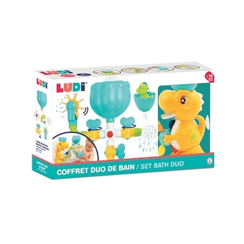 Een maxi badset om de effecten van water te ontdekken!Ontdek deze superleuke aquatische speelset voor urenlang plezier in bad! De set bestaat uit een grote grappige dinosaurus, een modulair watercircuit en een baby-dino waterspuiter.Interactieve Dino: Vul de kop van de dinosaurus met water; zodra het water door het mechanisme stroomt, komt het uit zijn bek en laat het de molentjes draaien!Magische Regen: Giet water in zijn eierschaal en zie hoe het als fijne regendruppels naar beneden valt.Waterspuiter: De baby-dino spuiter is speciaal ontworpen voor kleine handjes, zodat kinderen elkaar (en zichzelf) lekker nat kunnen sproeien!Een meegroeiend spelHet watercircuit bestaat uit een heel netwerk van buizen met kraantjes en talloze activiteiten om de effecten van water te ontdekken. Wanneer je kind water in het reservoir giet en de kraantjes opent, komt het hele circuit tot leven!De 9 onderdelen zijn onderling verwisselbaar, waardoor kinderen hun eigen parcours kunnen bouwen. Naarmate ze ouder worden, zullen ze het geweldig vinden om na te denken over en te experimenteren met ongewone opstellingen om hun watercircuit te testen. Laat de fantasie de vrije loop!Slim en praktischZowel de dino als het watercircuit zijn stevig en praktisch; ze kunnen worden losgekoppeld om als afzonderlijk speelgoed te dienen. Dankzij de sterke zuignappen zijn de activiteiten eenvoudig te bevestigen aan de badwand of op de tegels.Zodra je baby zelfstandig in een badring kan zitten, is deze set klaar voor gebruik. Het spel trekt de aandacht van de kleintjes en stimuleert niet alleen de verbeeldingskracht, maar ook de behendigheid.Kleine tip: Maak de zuignappen goed schoon en bevestig ze op een schoon en glad oppervlak voor een optimale grip.Kenmerken:Leeftijd: Geschikt voor kinderen vanaf 10 maanden.Afmetingen Dinosaurus: 9,5 x 24,5 x 17 cm.Afmetingen Watercircuit: 28 x 23 x 9 cm.Samenstelling: Dinosaurus (100% Polypropyleen), Watercircuit (ABS), Waterspuiter (100% PVC).Onderhoud: De speeltjes na gebruik laten uitlekken en regelmatig afspoelen/wassen met schoon water.