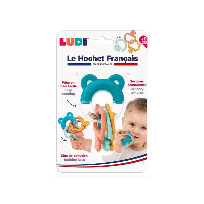 De Franse rammelaar!Deze bijtrammelaar met verschillende texturen is speciaal ontworpen om op te kauwen en zo het tandvlees van je baby te verzachten tijdens het doorkomen van de eerste tandjes. De getextureerde ring, de vrolijke kleuren en de rammelende kraaltjes stimuleren de zintuiglijke ontwikkeling van je kleintje.Gemaakt voor kleine handjesDe rammelaar is voorzien van 3 getextureerde sleutels, waardoor hij voor je baby heel gemakkelijk vast te pakken en vast te houden is. Terwijl je kindje de verschillende vormen en materialen ontdekt, wordt ook de fijne motoriek geoefend.Kwaliteit uit FrankrijkUniek aan dit product is dat het volledig in Frankrijk is vervaardigd, wat staat voor kwaliteit en zorgvuldigheid in het productieproces.Kenmerken:Leeftijd: Geschikt vanaf de geboorte (0+ maanden).Productie: Gefabriceerd in Frankrijk.Afmetingen: 6 x 11 x 6 cm.Samenstelling: TPE, ABS en TPR.Onderhoud: Eenvoudig schoon te maken met een vochtige doek.