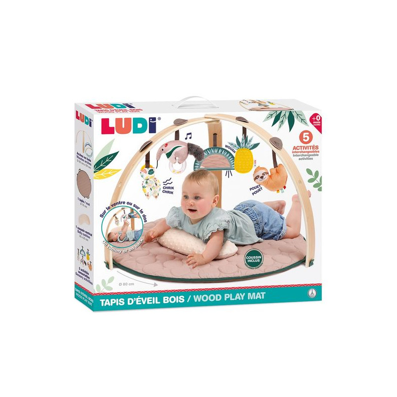 Een stijlvol en meegroeiend speelkleed voor je babyBied je kleintje een zachte en stimulerende speelruimte met dit elegant vormgegeven speelkleed. De houten bogen en de moduleerbare sensorische activiteiten maken het tot een echt nestje van ontdekking, aangepast aan de verschillende ontwikkelingsstadia van je baby.Een kleed dat meegroeit met je kindVanaf de geboorte: Je baby ligt comfortabel op de rug en ontdekt de hangende speeltjes, wat het gezichtsvermogen en de grijpreflex stimuleert. Dankzij de 9 ophangpunten zijn de activiteiten onderling verwisselbaar voor een gevarieerde ontdekkingstocht.Vanaf 6 maanden: Wanneer je baby begint te rollen en te kruipen, wordt het kleed een vrije bewegingsruimte. Het meegeleverde zachte buikkussen biedt hierbij optimaal comfort.Vanaf 1 jaar: Je kindje kan nu zelfstandig zitten en de omgeving verkennen. De afneembare bogen kunnen worden verwijderd om alle ruimte te geven aan vrij spel en sensorische ontwikkeling.Een wereld vol zintuiglijke activiteitenZicht: Kleurrijke patronen, sterke contrasten en een onbreekbare spiegel prikkelen de visuele ontwikkeling.Tast: Verschillende texturen om te ontdekken, van zachte stoffen en glad hout tot speeltjes met reliëf.Gehoor: Stimulerende geluidjes dankzij de rammelaar en het knisperpapier.Kenmerken:Leeftijd: Geschikt vanaf de geboorte.Afmetingen bogen: Ø 80 cm x 50 cm (hoogte).Afmeting kleed: Ø 78 cm.Flexibiliteit: De bogen zijn eenvoudig afneembaar.Samenstelling: 100% polyester.Onderhoud: Het kleed is wasbaar in de wasmachine (koud programma).