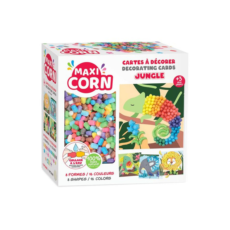 Een creatief en speels knutselpakket in het thema Jungle!Breng de jungle tot leven met deze originele knutselset! Met behulp van de 4 decoratiekaarten (de leeuw, de olifant, de kameleon en de papegaai) kunnen kinderen hun creativiteit de vrije loop laten, terwijl ze spelenderwijs hun fijne motoriek en concentratie verbeteren.Creëer dieren in 3DDeze set bevat maisvlokken in maar liefst 8 verschillende vormen en 16 vrolijke kleuren. Door de vlokken op de juiste plek op de kaarten te plakken, krijgen de dieren kleur en een prachtig 3D-effect.Een natuurlijke en magische activiteitDe MaxiCorn-vlokken zijn niet alleen leuk, maar ook heel bijzonder:Magische lijm: Bevochtig één kant van de vlok met een beetje water; het natuurlijke zetmeel in de mais komt vrij en werkt als lijm zodra het droogt.100% Veilig & Duurzaam: De vlokken bestaan volledig uit natuurlijke mais, water en voedingskleurstoffen. Ze zijn 100% biologisch afbreekbaar.Hecht overal: De vlokken plakken niet alleen op de bijgeleverde kaarten, maar ook op papier, karton, piepschuim en andere gladde oppervlakken.Inhoud van de set:4 geïllustreerde kaarten: Leeuw, Olifant, Kameleon en Papegaai.Assortiment maisvlokken: In 8 vormen en 16 kleuren.Kenmerken:Leeftijd: Geschikt voor kinderen vanaf 3 jaar.Samenstelling: 100% mais en voedingskleurstoffen.Milieuvriendelijk: 100% biologisch afbreekbaar spel.Geef de dieren uit de jungle hun kleuren terug met dit milieuvriendelijke en creatieve avontuur!
