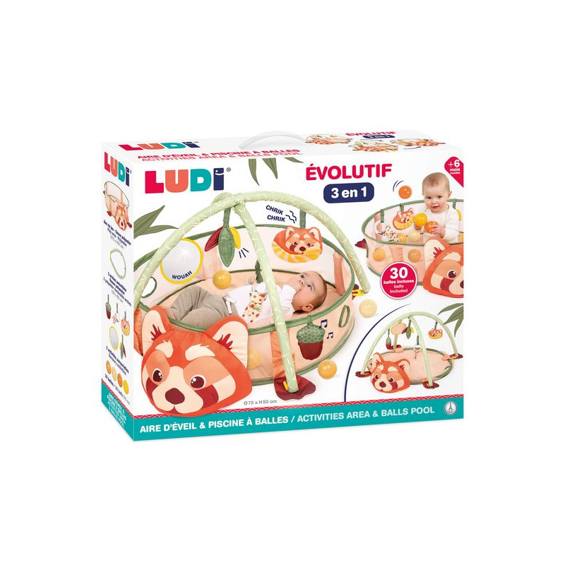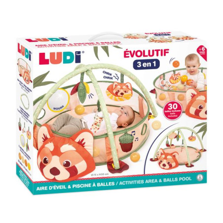 PANDA speelplek en ballenbak: een 3-in-1 evoluerende speelplek die je baby begeleidt bij zijn ontdekkingen! Bevat 30 veelkleurige ballen, verwijderbare bogen en verwisselbare activiteiten. Vanaf 0 maanden.