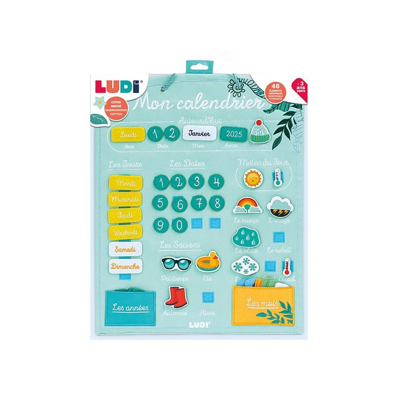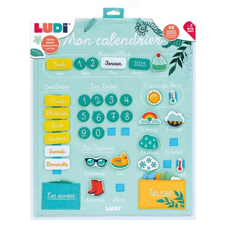 Reis door de tijd, dag na dag!Deze prachtige wandkalender van geborduurd textiel helpt kinderen om het concept 'tijd' te begrijpen en te beheersen. Dankzij de afneembare elementen van vilt kunnen kleine ontdekkers elke dag spelenderwijs de dagen van de week, de maanden, de seizoenen en zelfs het weer ontdekken!Leren wordt kinderspel!Samen met hun ouders leren kinderen stap voor stap hoe een jaar in elkaar zit. Dit versterkt hun zelfvertrouwen en stimuleert de zelfstandigheid. Elke ochtend wordt een spannend nieuw avontuur om de dag goed te beginnen!Een slim en speels ontwerpDe kalender is gemaakt van zacht, geborduurd katoen en is eenvoudig aan de muur te bevestigen met het handige koordje.Makkelijk in gebruik: De kaartjes met klittenband zijn perfect afgestemd op kleine handjes, zodat kinderen de elementen eenvoudig zelf kunnen verplaatsen.Altijd opgeruimd: De kalender heeft geïntegreerde opbergvakjes onderaan, zodat elk los onderdeel een eigen plekje heeft en er niets kwijtraakt.Interactieve elementenDe kalender bevat alles wat nodig is om je te oriënteren in de tijd:7 dagen van de week12 maanden4 seizoenen12 cijfers (voor de datum)6 jaartallen5 weertypesKenmerken:Leeftijd: Geschikt voor kinderen vanaf 3 jaar.Afmetingen: 38 x 47 x 0,5 cm.Materiaal: 100% katoen.Onderhoud: Afneembaar met een vochtige doek. Plat laten drogen.Variatie: Ook verkrijgbaar in de kleur Koraal.Let op: Bevat kleine onderdelen (verstikkingsgevaar). Gebruik onder toezicht van een volwassene.