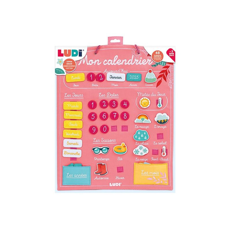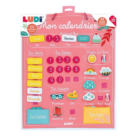 Reis door de tijd, dag na dag! Deze geborduurde stoffen wandkalender helpt kinderen het verstrijken van de tijd te begrijpen en te beheersen. Dankzij de verwijderbare vilten elementen kunnen nieuwsgierige kleintjes spelenderwijs de dagen