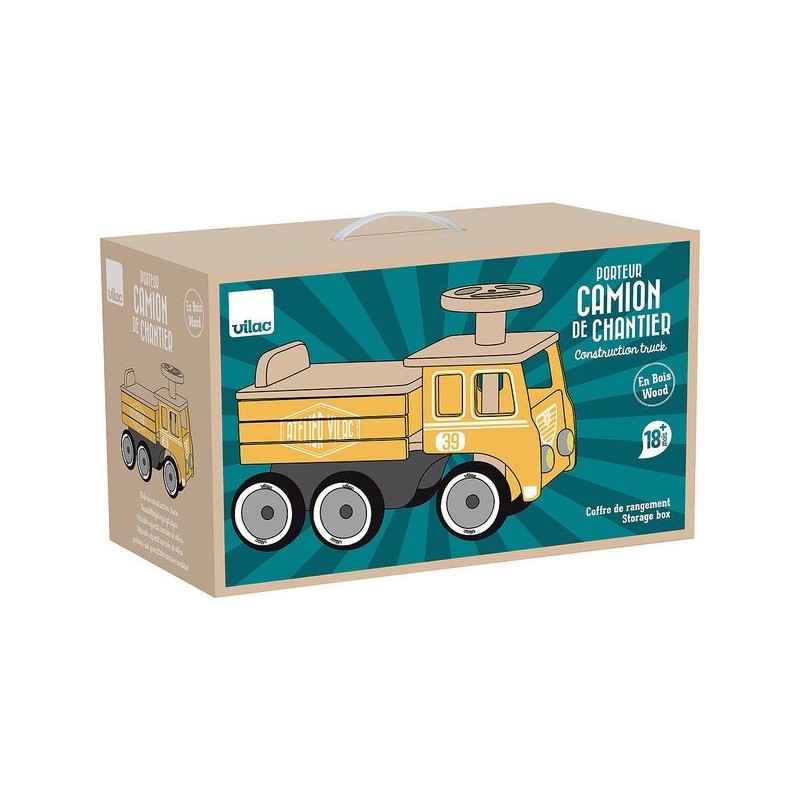 Houten bouwvrachtwagen - vanaf 18 maanden. Gebruikt de kleine opbergdoos onder de stoel om Doudou te dragen. Met anti-kantelsysteem aan de achterkant.