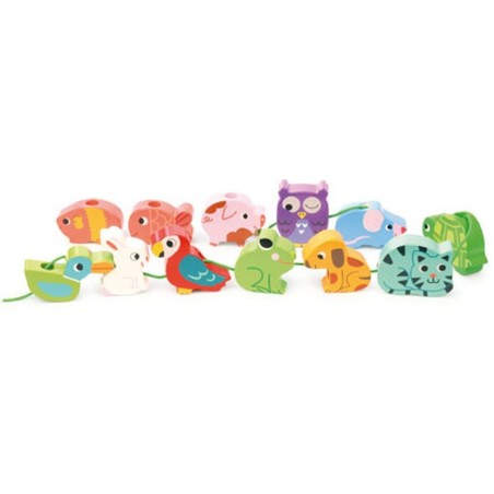 Grote houten kralen om te rijgen op het thema van dieren speciaal ontworpen voor 18 maanden en ouder. Een spel dat de fijne motoriek helpt ontwikkelen.