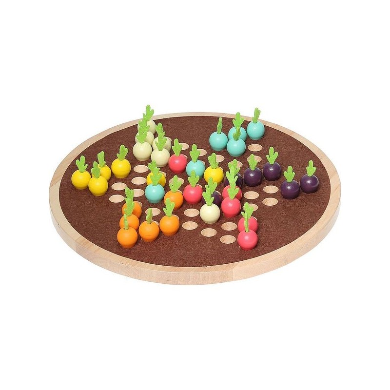 La traversée du potager" is een bewerking van het Chinese damspel, een traditioneel spel dat erin bestaat je stukken naar de tegenoverliggende stertak te verplaatsen.Met dit spel vervolledigt Vilac zijn reeds zeer succesvolle moestuinassortiment, met name met "Mémotager" of "La bataille du potager". Met groenten en door het spel voor de jongsten te vereenvoudigen, wordt het nog leuker!Kun je voorkomen dat de andere tuiniers je voor zijn? Zal je slim genoeg zijn om hun obstakels te ontwijken?Een origineel houten spel voor de hele familie.Een katoenen zak om de stukken in te bewaren... maar het is zo mooi dat het ook als decoratie op een plank kan blijven staan!