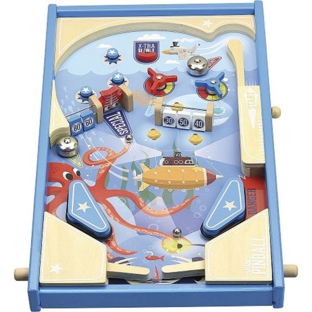 Net als de grote jongens! Deze houten flipperkast wordt geleverd met 3 metalen ballen om de doelen neer te halen, de klokken te activeren, de draaihekken weg te halen... Scoor de meeste punten en win de strijd onder de zee. Afneembare houten poten. Vanaf 5 jaar oud.