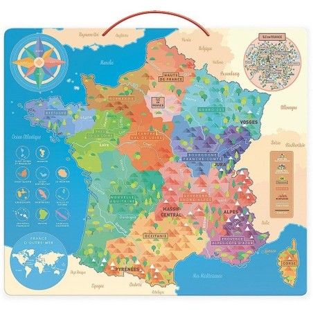 Educatieve kaart met 92 houten magneten. De nieuwe regio's leren kennen, de namen van de departementen, de belangrijkste steden, de belangrijkste wegen, de rivieren, de zeeën en oceanen, de bergmassieven, de Franse overzeese gebiedsdelen en de buurlanden.