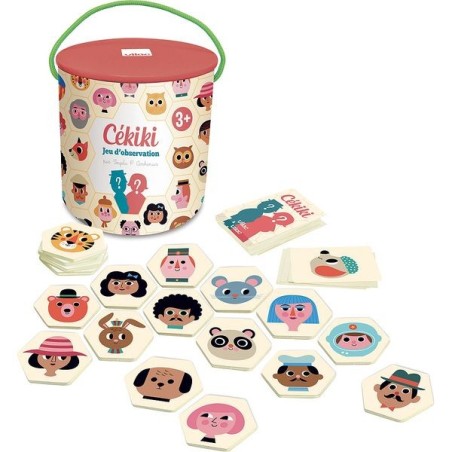 Cékiki is niet 1 maar 2 spellen!- Cékiki is een deductiespel: vind je tussen alle houten stukken het personage dat de ander heeft gekozen? Heeft hij een snor? Blond haar? Is het een dier? Er zijn vele mogelijkheden onder de 100 karakters ontworpen door Ingela P. Arrhenius. Ben jij de slimste om de oplossing eerder te vinden dan de ander?- De andere regel van het Cékiki-spel is een spel van observatie en snelheid: je trekt een kaart en je moet de snelste zijn om het overeenkomstige houten stuk te vinden tussen de 99 andere... sfeer gegarandeerd en pas op voor valstrikken!