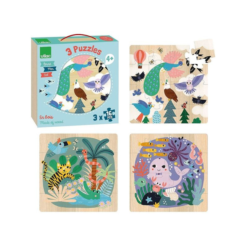 Een prachtige doos met drie houten puzzels. Poëtisch geïllustreerd door Michelle Carlslund, stellen deze drie puzzels drie scènes voor in verschillende natuurlijke omgevingen: op het land, in de zee en in de lucht. Een tafereel in de wolken met een prachtige pauw, adelaar, uil en andere verschillende vogels.Een andere scène in de zee met een grote walvis, een octopus, zeepaardjes en hun kleine visvriendjes.Tot slot een junglescène met een tijger die speelt met een krokodil, een slang en een papegaai.Deze puzzels stimuleren de behendigheid en het observatievermogen.Vilac 8536 - Puzzels - Houten speelgoed - Vanaf 4 jaar.Inhoud: 3 puzzels met elk 16 stukjes.Illustraties van Michelle Carlslund.