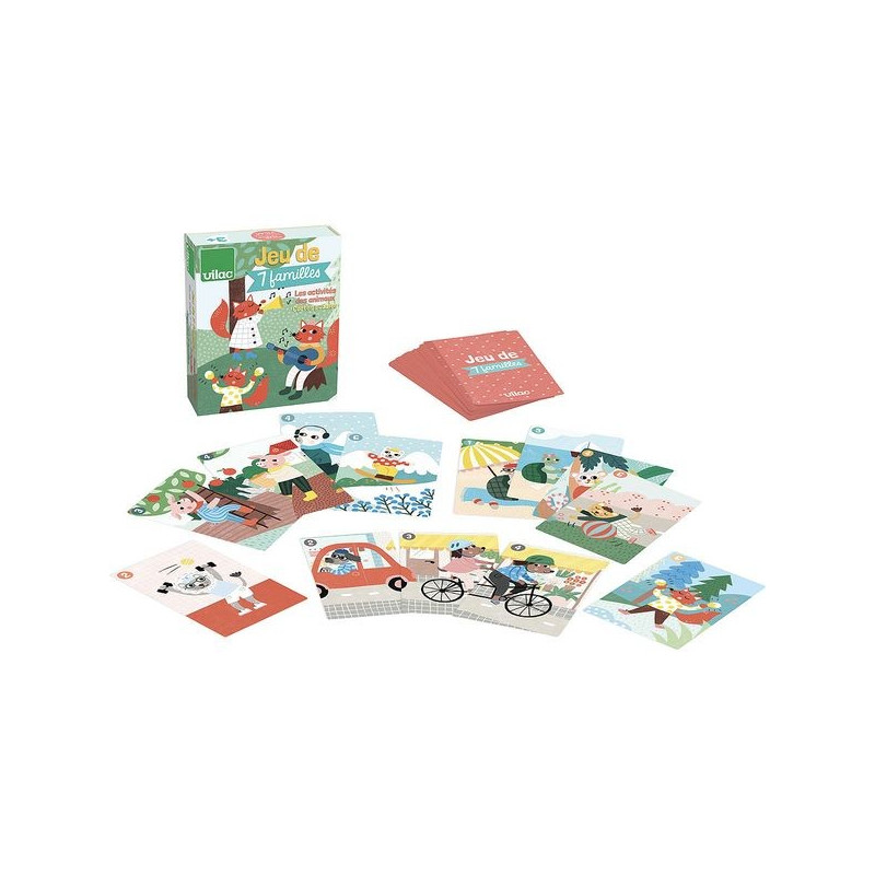 Een spel voor zeven gezinnen, poëtisch geïllustreerd door Michelle Carlslund.In de ijsberenfamilie vraag ik naar de oma die skiet! In de vossenfamilie vraag ik naar het meisje dat de Djembe speelt!Ontdek de wereld van de 7 dierenfamilies: sport, muziek, ontspanning, stad, acrobaten, wintersport en boerenleven.De 6 kaarten van elke familie vormen een panoramisch tafereel wanneer ze naast elkaar worden gelegd.Een origineel must-have kaartspel!