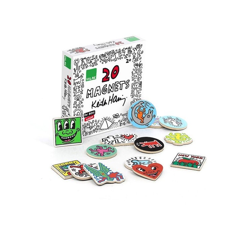 Een doos met 20 houten verzamelmagneten om je huis te versieren met iconische tekeningen van Keith Haring.Vilac was een van de eerste bedrijven die samenwerkte met de Amerikaanse kunstenaar Keith Haring, een van de pioniers van de Pop Art en Street Art, toen zijn kunst nog niet zo beroemd was als nu.Zijn iconografie is een doorlopende vertelling van baby's, engelen, vliegende schotels, tv-toestellen enz. die eindeloos wordt herhaald met zijn herkenbare zwarte klauw.