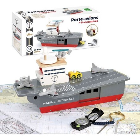 Origineler dan de traditionele garage, hier is het houten vliegdekschip Vilac X Marine Nationale. Met zijn vele vliegtuigen en zijn lift waarmee ze in de romp kunnen worden neergelaten, blijven kinderen zich verbazen! Laat de fantasie van uw kinderen op hol slaan met het Vilac X Marine Nationale houten vliegdekschip! Het wordt geleverd met twee gevechtsvliegtuigen, een luchtdetectievliegtuig, een helikopter en een dektractor. De vleugels van het vliegtuig klappen op zodat ze het kasteel van het gebouw, waarin een lift verborgen zit, kunnen betreden. Kinderen kunnen ze in de romp laten zakken en ze dan ophalen door de openingen aan de achterkant en zijkant van de drager. Onderhoud, rijden, katapulteren, vliegen, aanmeren... Eén ding is zeker: aan zout zal het deze missies niet ontbreken!Speelgoed voor kinderen vanaf 3 jaar.