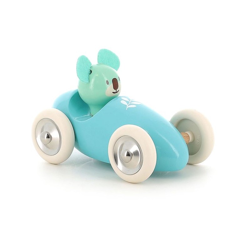 Deze gelakte houten auto is verkrijgbaar als muziekdoos, rammelaar en paraplu en maakt deel uit van een collectie dieren die in ons atelier in de Franse Jura zijn bedacht en gemaakt. Een groep vrienden bestaande uit René de pinguïn, Marcel de beer, Raoul het konijn, Alice de koala, Mariette het poesje en tenslotte Lucien de hond. Gemaakt in Frankrijk, is dit speelgoed gelakt volgens een uniek procedé van onderdompeling in lakbaden dat de reputatie van ons atelier in de Jura maakt.